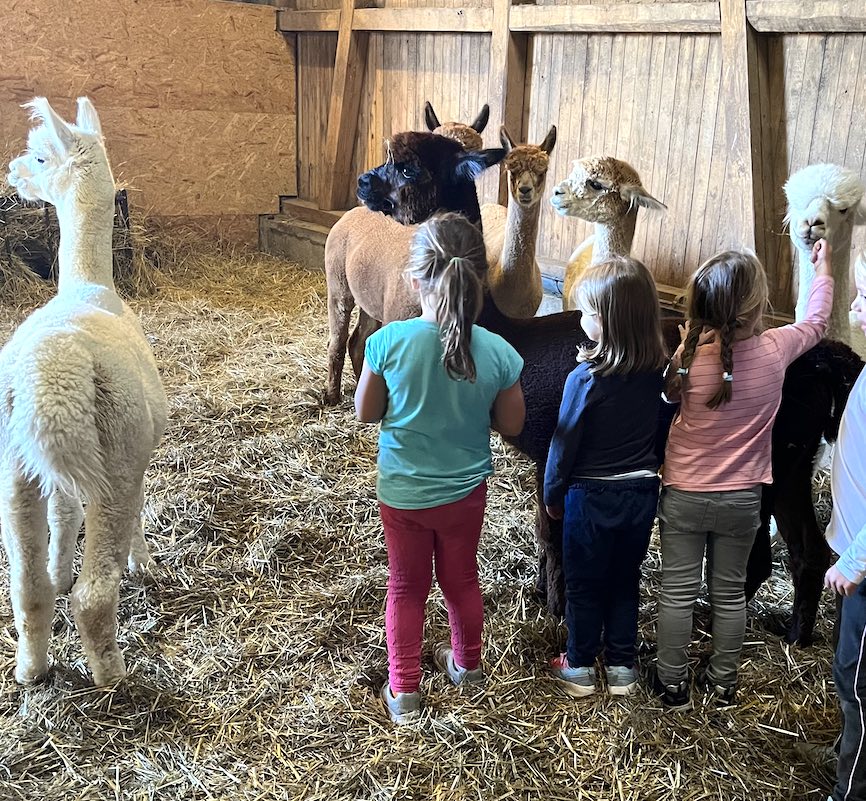 B: Familienzeit auf der Weide für Familien mit kleinen Kindern, gerne auch mit Oma und Opa. Begrüßung, Fütterung, Streicheln im Stall. Danach begleitete Zeit auf der Weide mit Beobachtung, Entdecken, kleinen Impulsen und natürlich Erinnerungfotos machen.