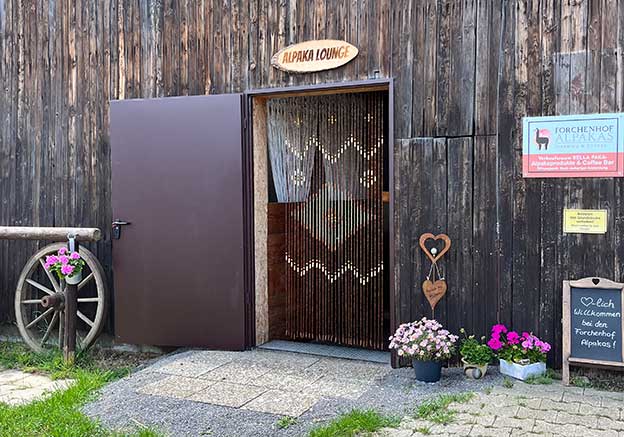 Ort: Alpaka-Lounge mit Blick auf Alpakas und Alpakaweide (bei schönem Wetter)